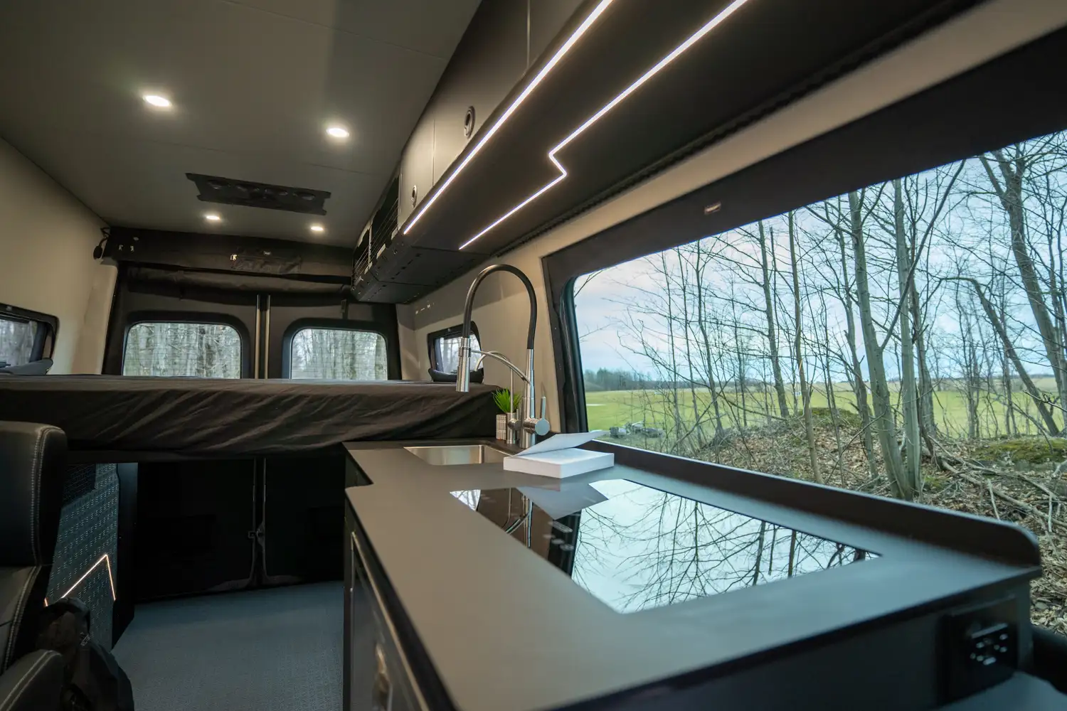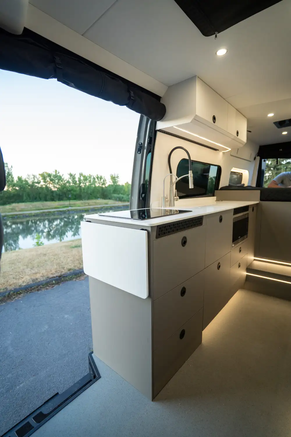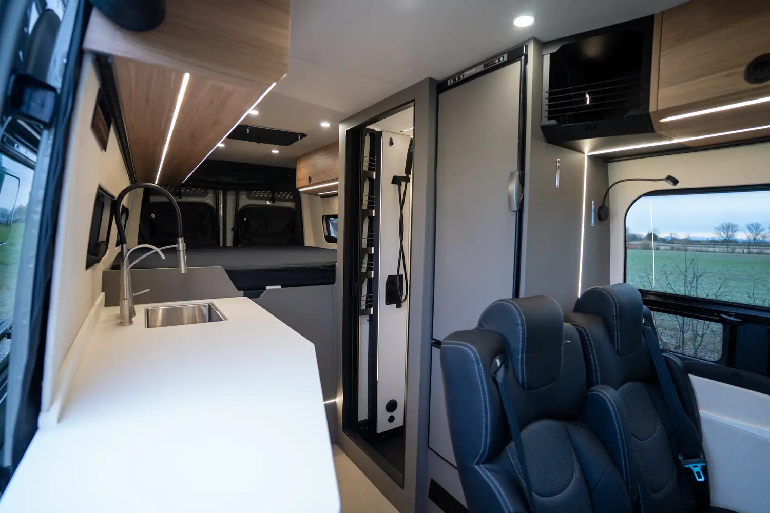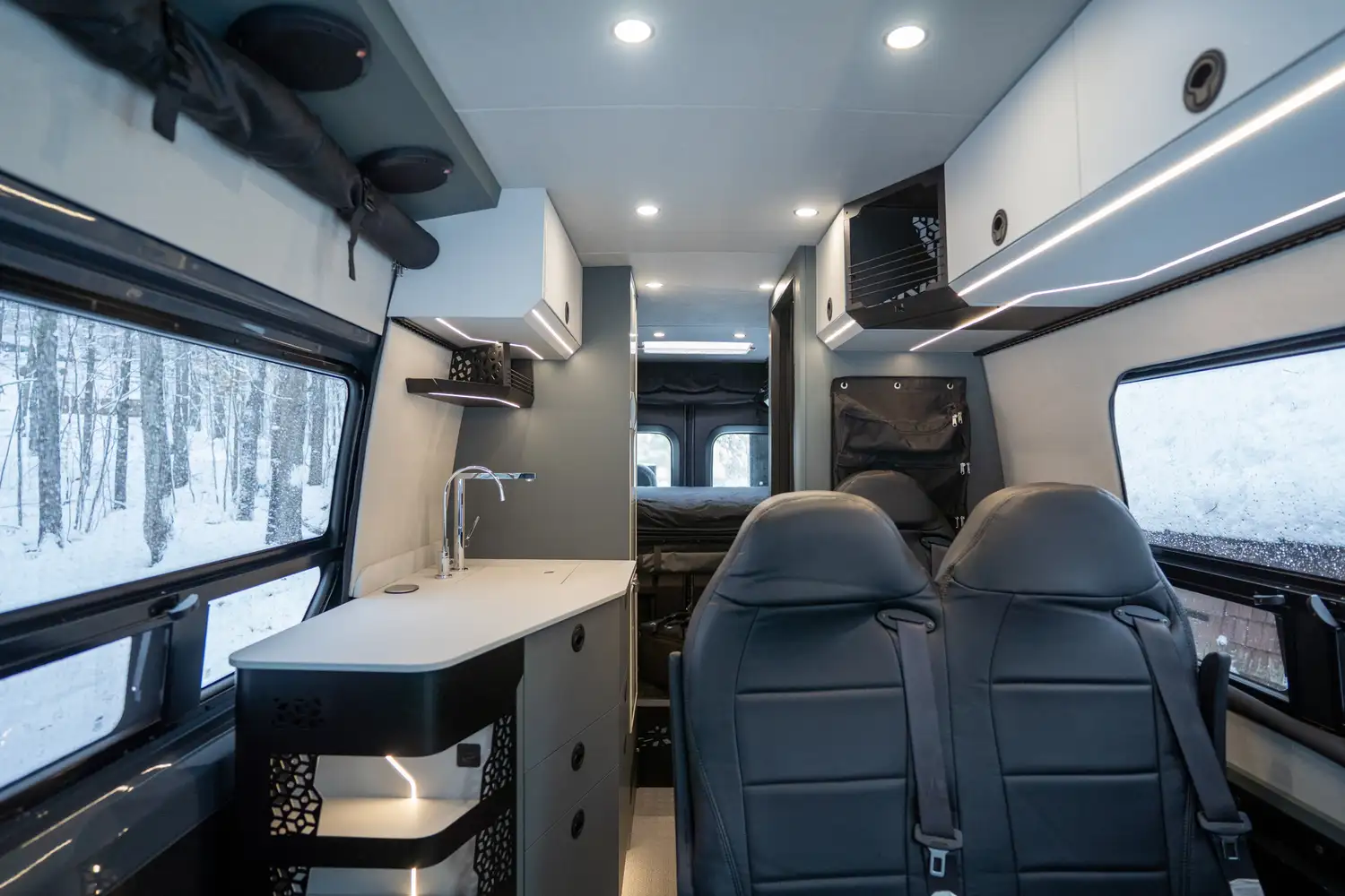 Conçu pour les couples souhaitant partir sur la route plusieurs semaines, le ONYX offre une grande cuisine complète, une douche intérieure et un grand garage arrière pour tout l’équipement de plein air. Une vraie mini-maison mobile pour le confort et l’autonomie sur la route.