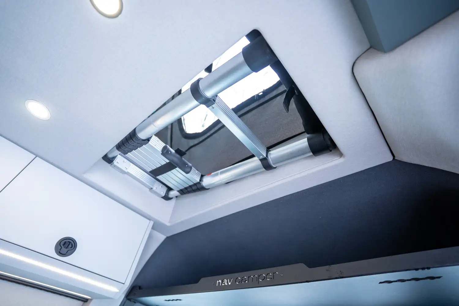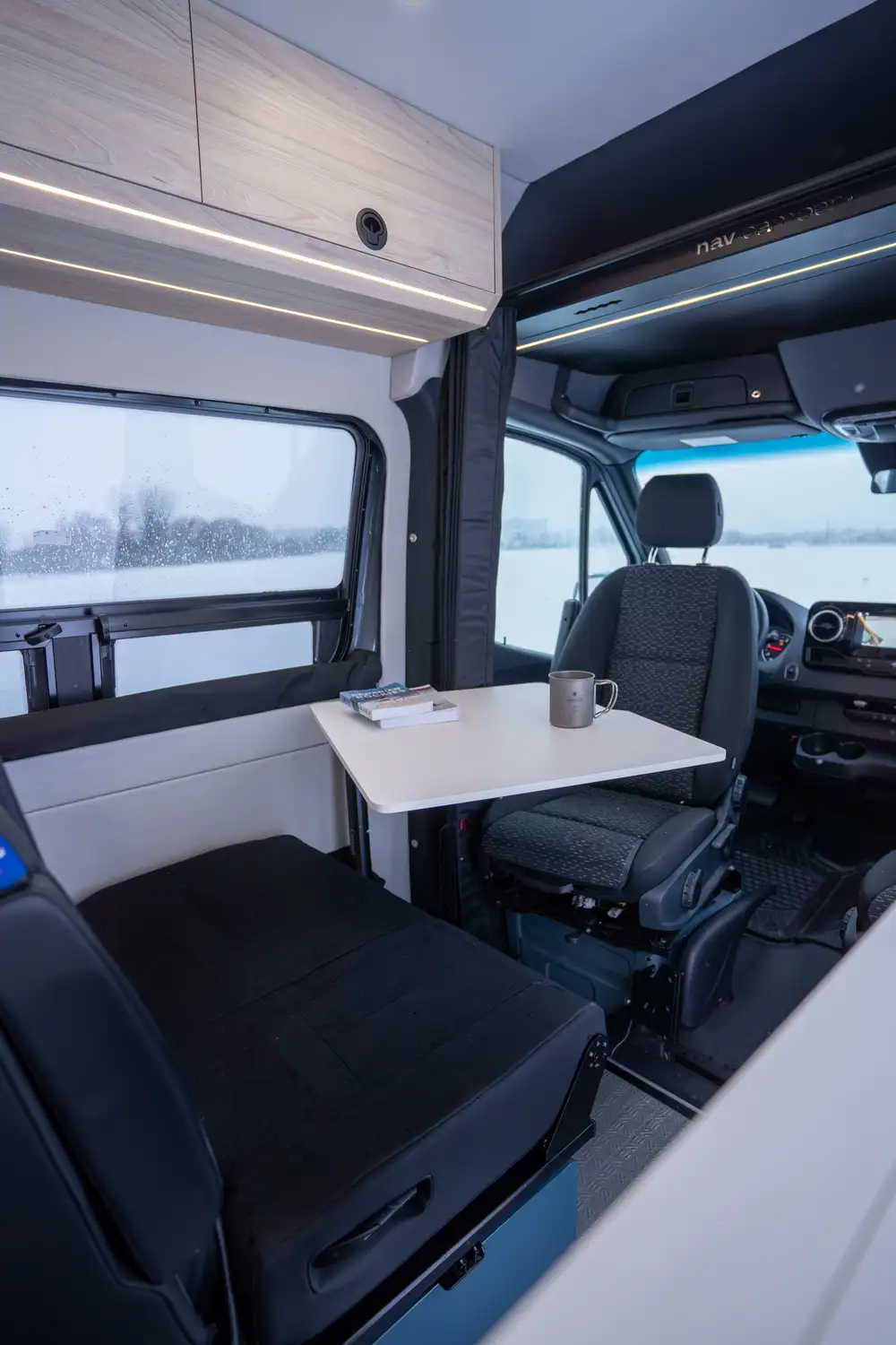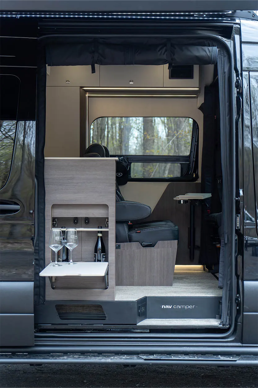 Le ARYA, le modèle le plus luxueux de la gamme Nav Camper, allie confort, élégance et espaces de vie généreux. Sa banquette modulable se transforme facilement en lit, son garage arrière offre un rangement optimal pour sacs et équipements, et il peut être équipé d’une douche pleine grandeur. Conçu pour les longs voyages et le travail nomade, l’ARYA incarne le van haut de gamme par excellence.