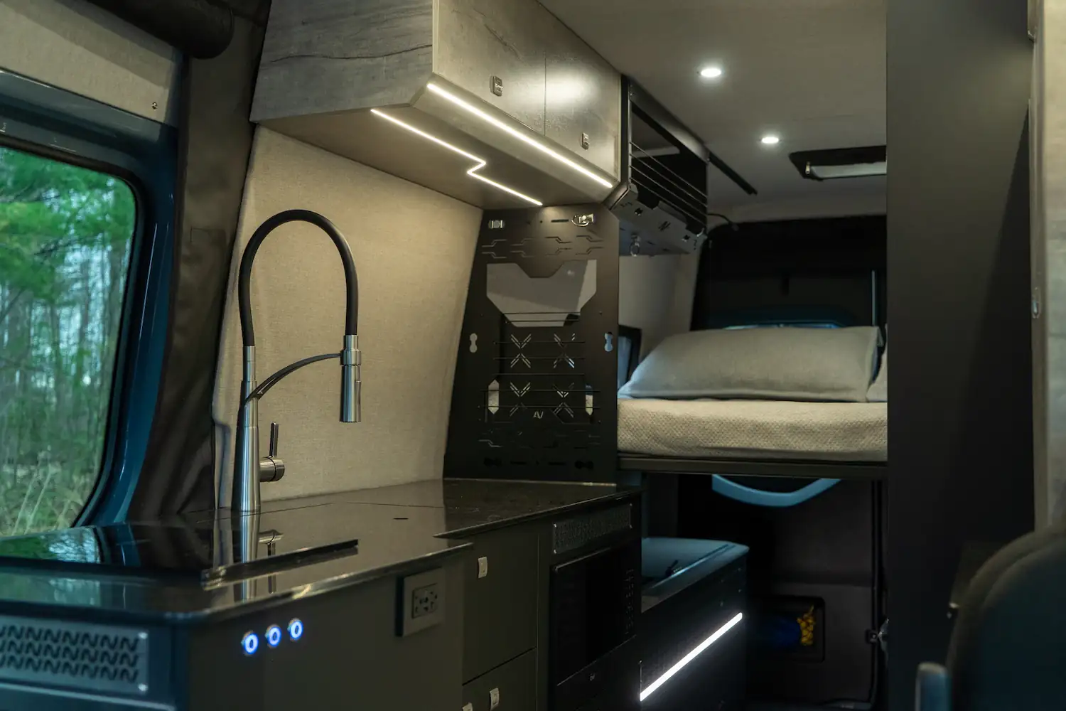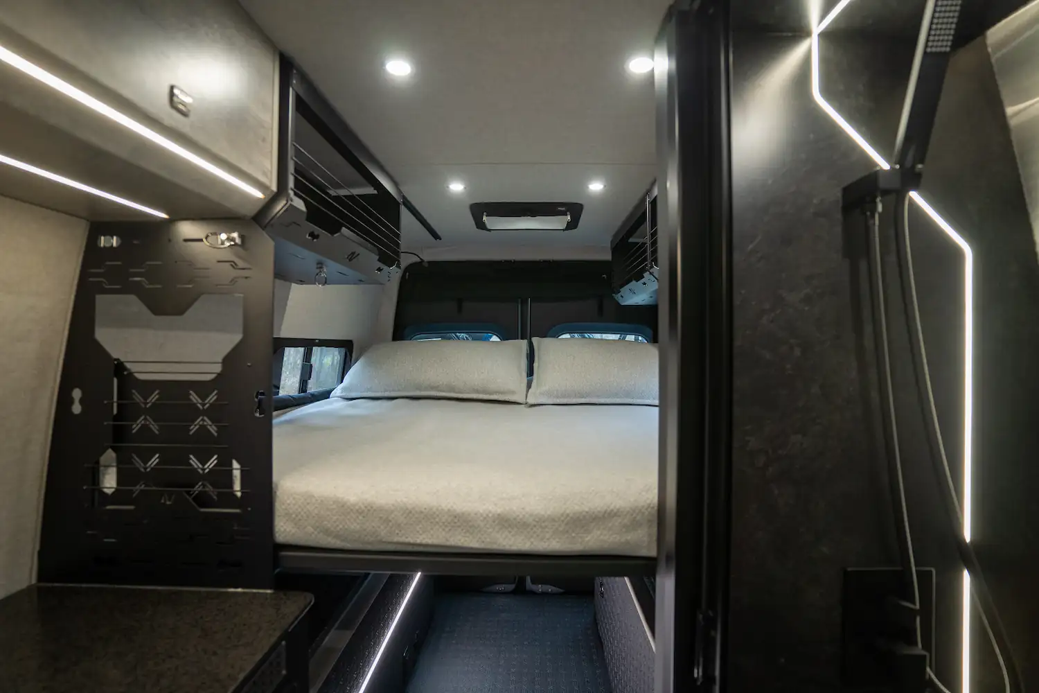 Pour l’extérieur, le ONYX Rocky Mountain est conçu pour affronter tous les terrains. Il est équipé de roues surdimensionnées, d’un système de suspension avancé, de pare-chocs robustes avant et arrière, d’une terrasse sur le toit, et d’un système d’éclairage performant, offrant sécurité, polyvalence et style lors de vos aventures.