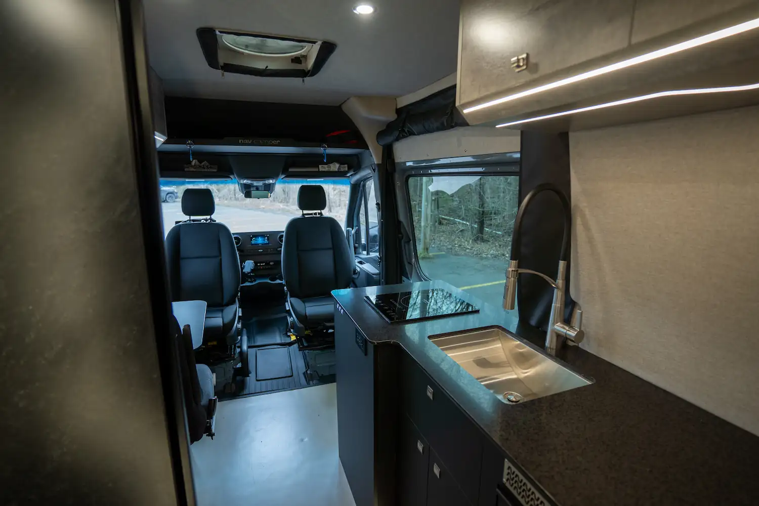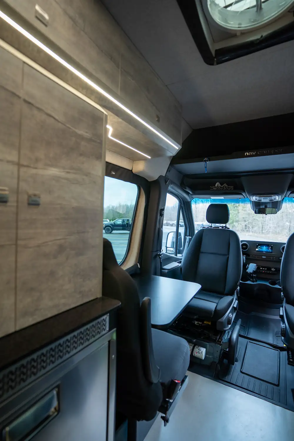 À l’intérieur, ce véhicule dispose d’une douche intérieure, d’une banquette avec table sur pivot, d’un grand comptoir de cuisine, d’une plaque à induction simple et de nombreux espaces de rangement, pour un quotidien confortable sur la route.